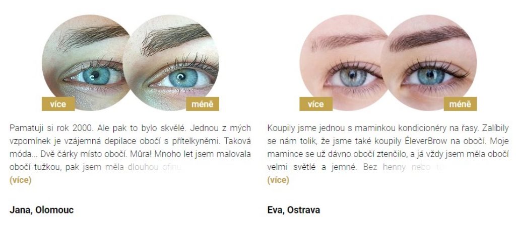 «Pamatuji si rok 2000. Byl to skvělý rok. Jednou z mých vzpomínek je, jak jsme si s přáteli vytrhali obočí. Byla to móda … Místo obočí dva pruhy. Horor! Celé roky jsem si obočí maloval tužkou, pak jsem ze studu použil třásně … Používám EleverBrow několik měsíců a jsem ohromen. Můj obličej vypadá jinak. Lepší, přirozenější. Bohužel s tužkovými liniemi měl můj obličej vždy „válečný“ vzhled. Nyní obočí vypadá výrazně a zároveň měkce. Nosím EleverBrow a jsou chvíle, kdy nenosím make-up a vypadám dobře. Hluboké obočí a řasy jsou v pořádku. »