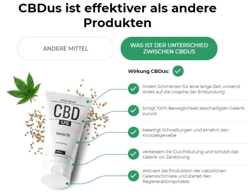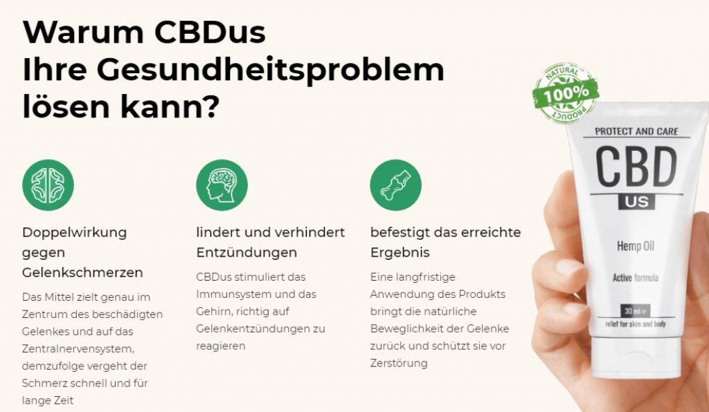 CBDus ist eine innovative Formel, die von Experten entwickelt wurde, um die Probleme, die Sie in Ihren Gelenken spüren, zu bekämpfen und zu verkaufen. Sein Erfolg beruht auf der Tatsache, dass es eine exklusive natürliche Zusammensetzung hat. Daher ist es sicher, da es keine gesundheitsschädlichen Auswirkungen hat.