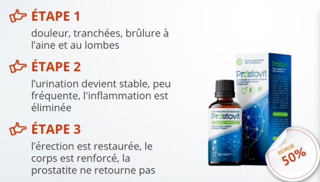 Prostovit peut aider à réduire l’inflammation de la prostate et à améliorer la qualité de l’urine. De plus, il peut vous aider à avoir une vie sexuelle active en récupérant l’érection naturelle, ainsi que la force et empêche la prostatite de se reproduire.