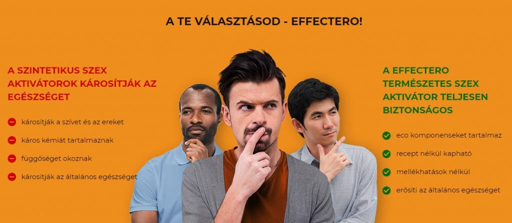 Az EffectEro azért jobb, mint a Viagra, a Cialis és más olyan gyógyszerek, amelyek csak az erekció elérését szolgálják (nem beszélve arról, hogy ezek a gyógyszerek nem befolyásolják a szexuális vágyat, vagy más kérdéseket, csak pusztán az erekció elérését), hogy az EffectEro biztonságos férfi egészség.